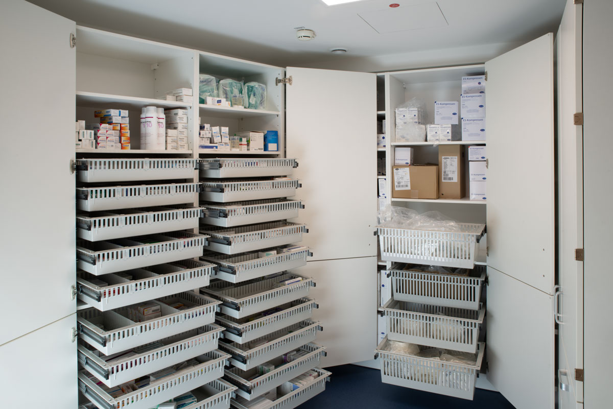 Die im ISO System verwendeten Kunststoffbehälter lassen sich leicht reinigen, weshalb sie zur Hygiene-Verbesserung beitragen. Wegen der schnelleren Einsehbarkeit erhielten die Hochschränke oben höhenveränderliche Einlegeböden. Jeder Medikamentenschrank erhält Türen mit Weitwinkelscharnieren. So verbessern Modulschränke die Übersichtlichkeit und vermeiden Arbeitsbehinderungen. Bitte nehmen Sie gleich Kontakt auf: www.adam-kuechen.de