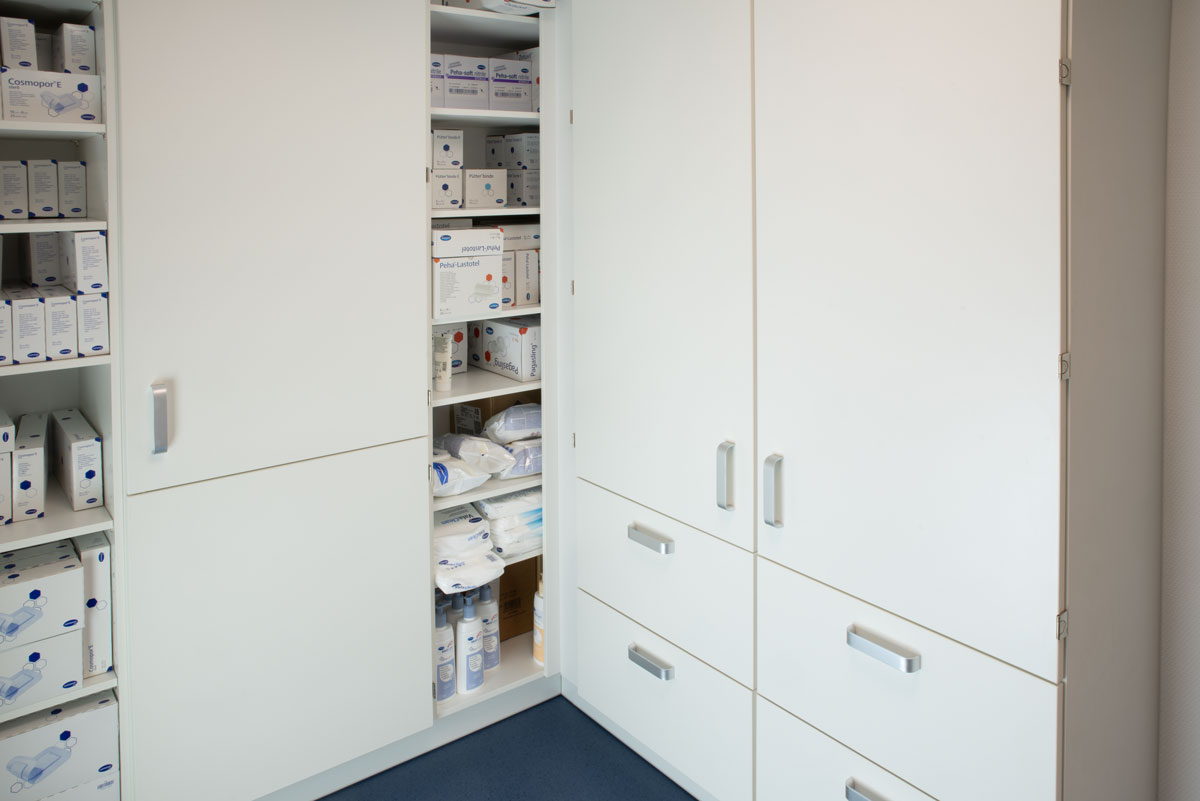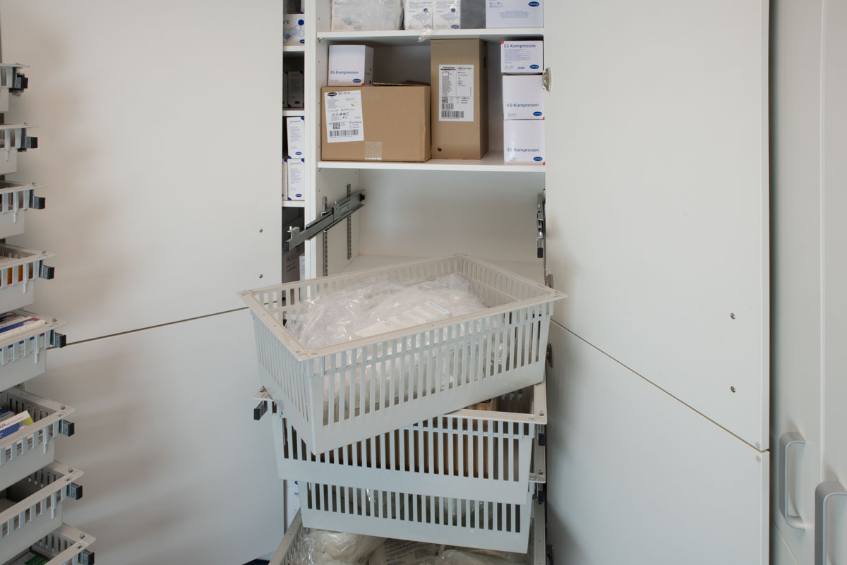 Einige Hilfsmittel sind in Beuteln verpackt. Dafür baut adam einen speziellen Medizinschrank mit hohen Körben. Große Pakete finden auf höhenveränderlichen Einlegeböden Platz. Um die verfügbare Raumfläche bestens zu nutzen, plant adam in den Ecken Regale. Diese finden für Großpackungen sinnvolle Verwendung.