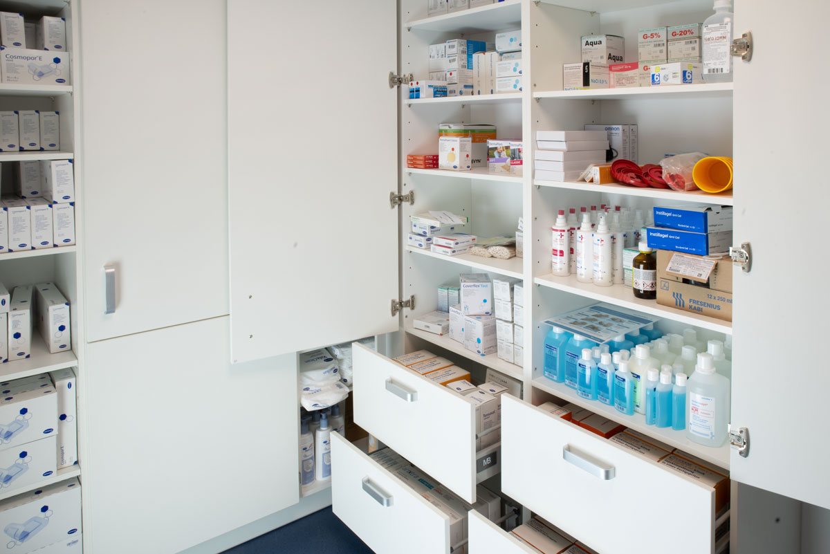 Die im Beispiel genannten Apothekenmöbel befinden sich in einem abgeschlossenen Raum. Damit ist die Medizin z.B. vor unbefugtem Zugriff geschützt.