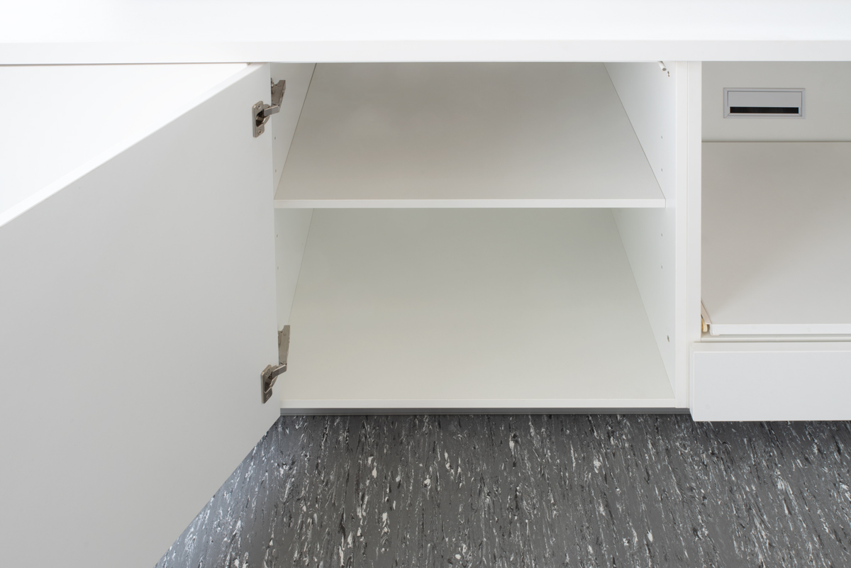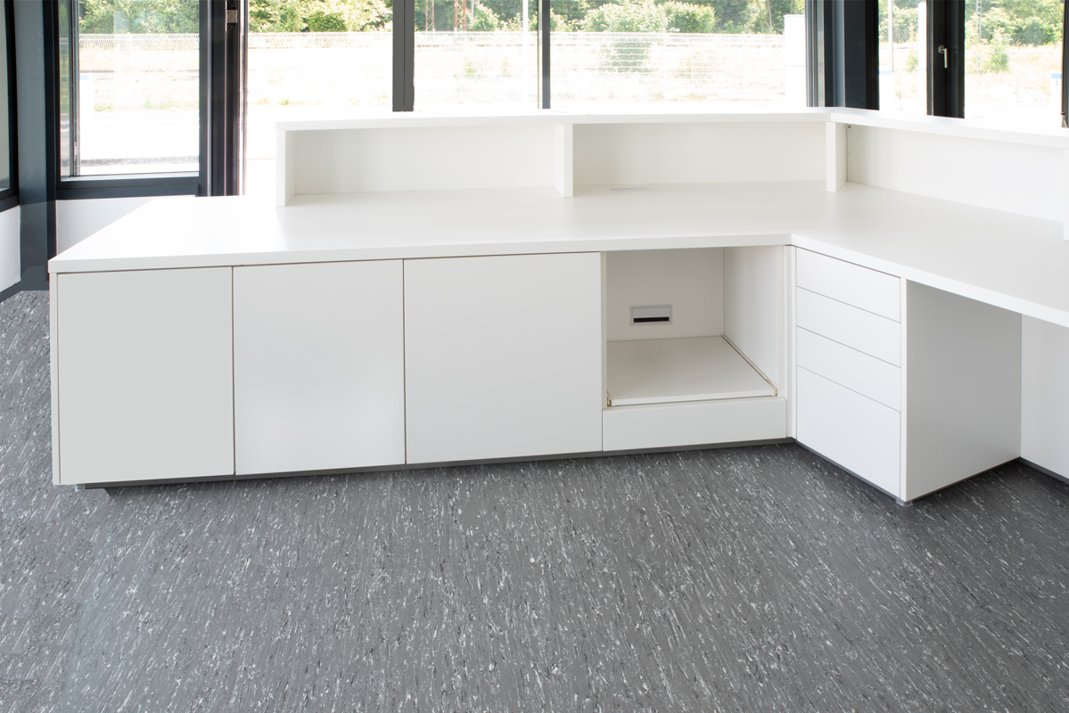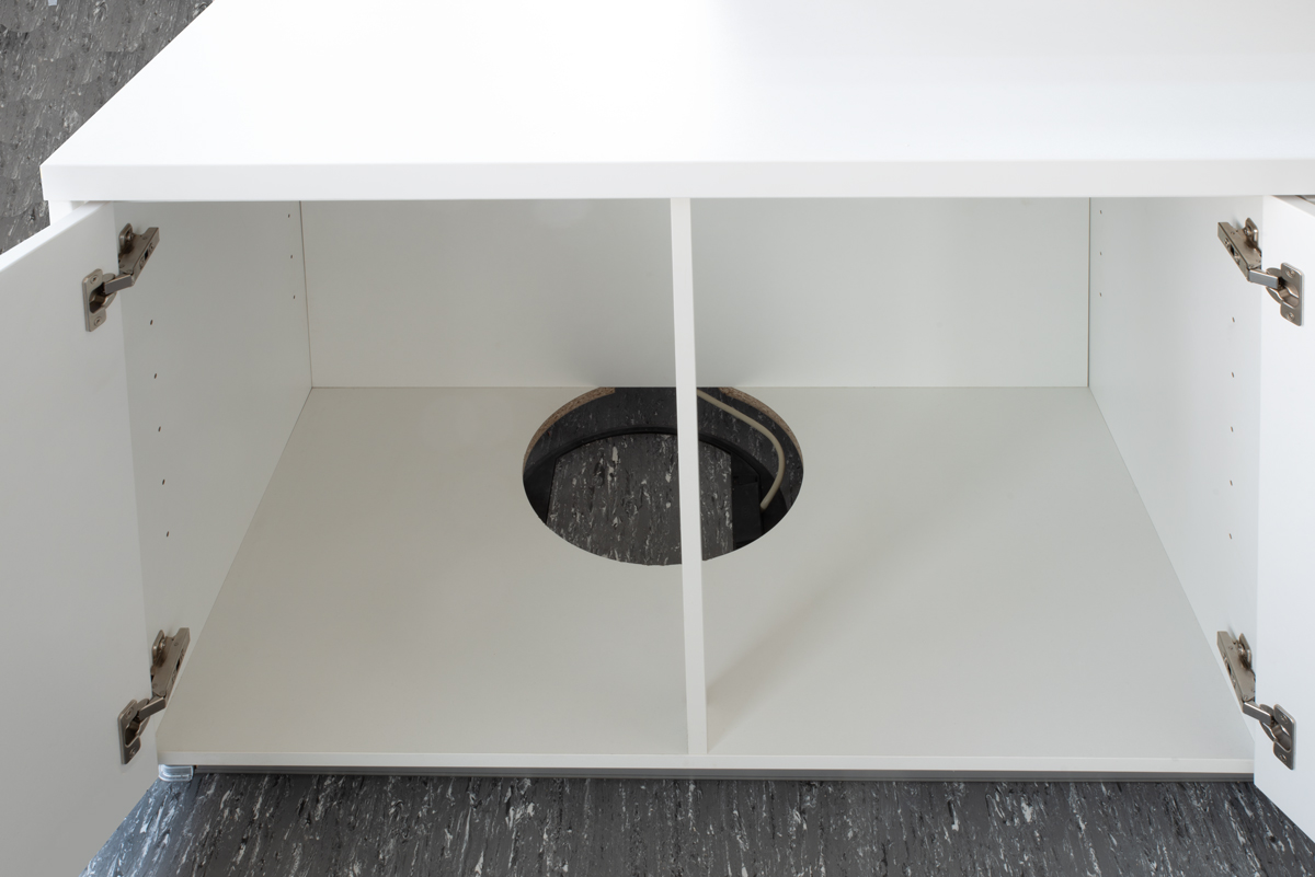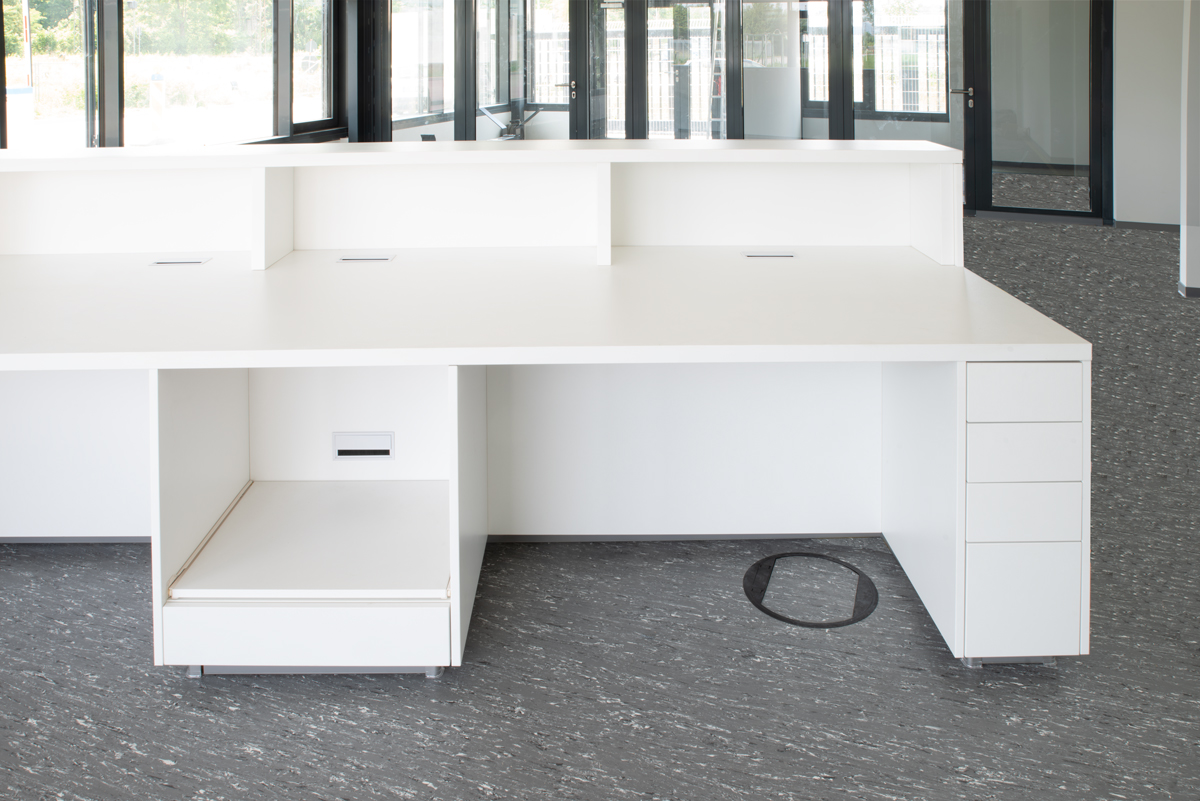 Am äußeren Ende des kurzen Schenkels steht ein Aktenschrank mit 5cm hohem Sockel. In seinem Boden befindet sich ein genügend großer Ausschnitt, um einen Bodentank erreichen zu können. Dieser Bodentank stellt Daten- und Elektroleitungen für Ihren Empfangstresen bereit.