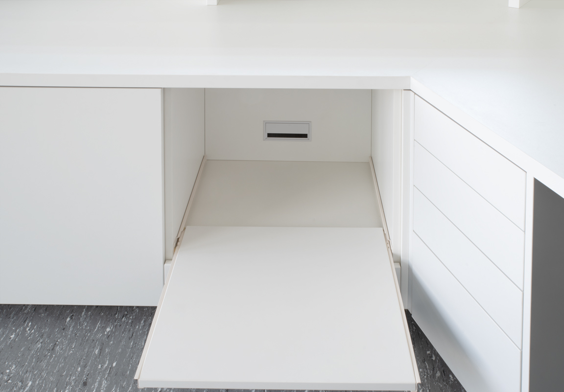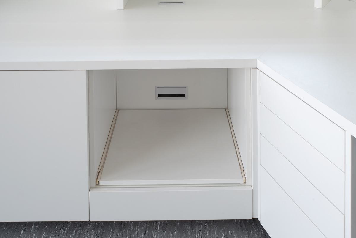 Damit lässt sich ein Drucker leicht aus dem Schrank ziehen. Die Rückwand des Druckerschrankes enthält einen großen Kabeldurchlaß, um den Drucker versorgen zu können. Weil sich im Druckerbereich ein weiterer Bodentank befindet, kann man die Schrankrückwand einfach komplett herausnehmen. #tresen