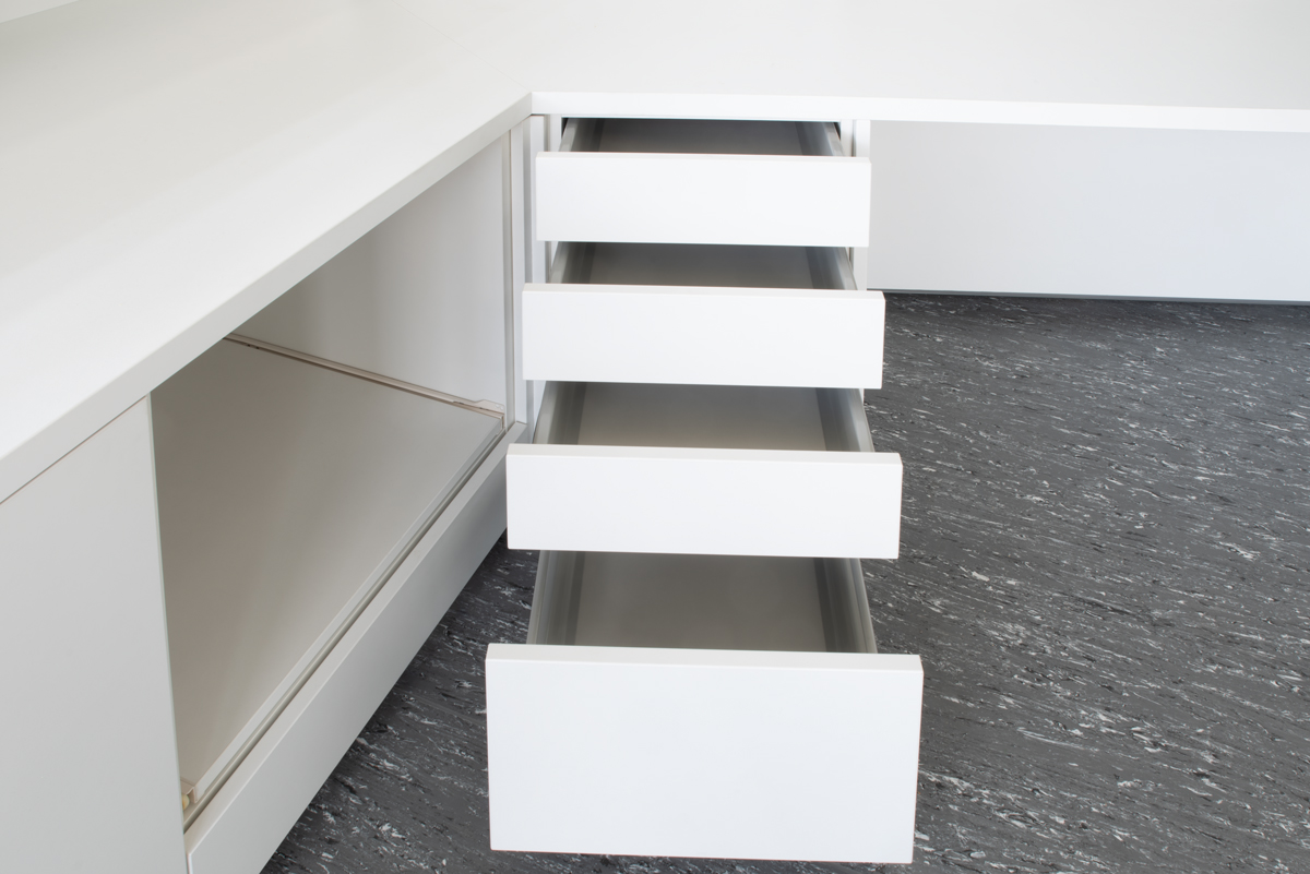 Unter dem inneren Ende des langen Schenkels steht ein Utensilienschrank. Durch vier großzügig bemessene Schubkästen bietet der Schrank viel Raum für Schreibmaterial.